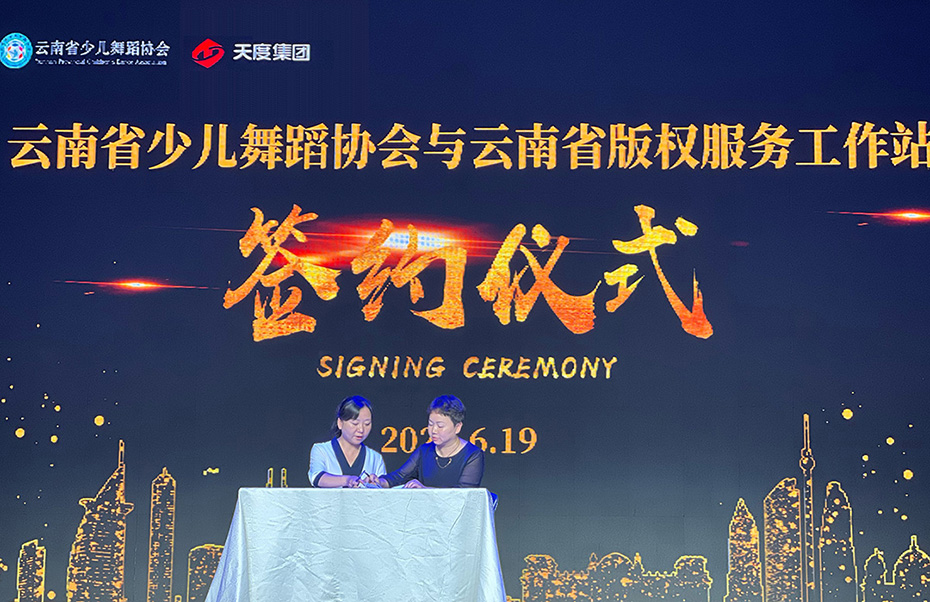 在頒獎(jiǎng)典禮現(xiàn)場,云南省少兒舞蹈協(xié)會(huì)與云南天度知識(shí)產(chǎn)權(quán)代理有限公司共同簽署《深化版權(quán)保護(hù)合作協(xié)議》,雙方將以本次大賽為契機(jī)、以版權(quán)服務(wù)工作站為支撐,全力打造云南省少兒舞蹈原創(chuàng)作品版權(quán)公共服務(wù)平臺(tái),并在該領(lǐng)域推廣版權(quán)登記、優(yōu)化版權(quán)生態(tài)、強(qiáng)化版權(quán)保護(hù)、推動(dòng)創(chuàng)新發(fā)展等方面發(fā)揮積極力量。